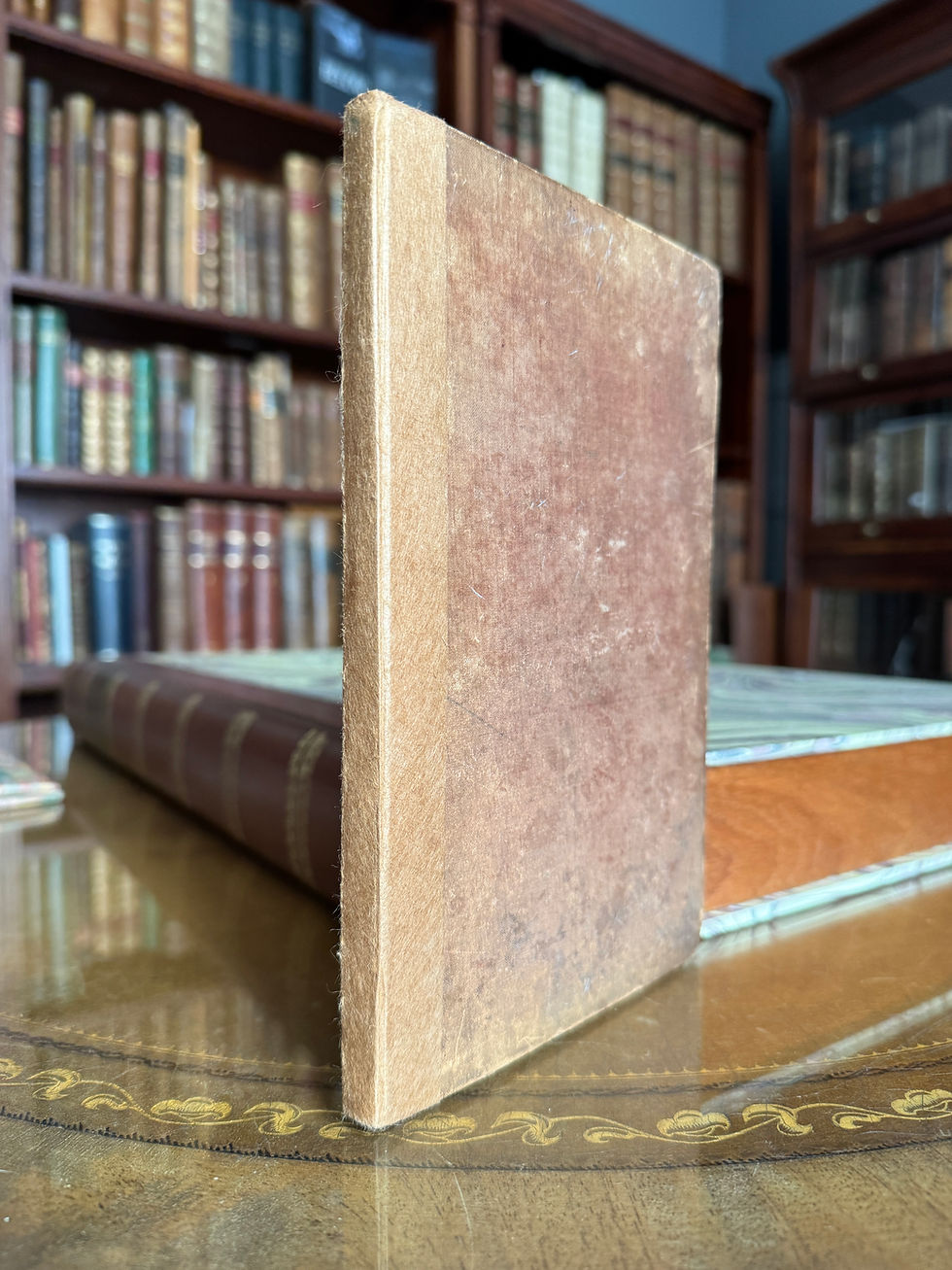 Eight folio volumes in quarter leather with marbled paper over boards. Four volumes in light brown leather and four in dark brown. Raised bands and gold text and details on spines. Hinges, heads, and tails variable cracked and chipped—One with significant loss to tail of spine. Most hinges cracked. Title pages vary from solid yellow, to white architectural. Variable damp stain affecting many plates and leaves, most significantly in gutters of first few volumes. Tom II, Plate 119: diffusely involved by faint mottled damp stain.